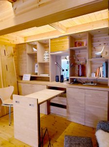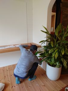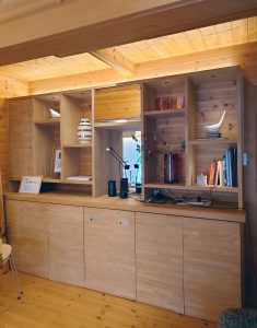 技術においても建て方大工さんと造作大工さんがいて、造作大工さんによって、一点ものの作りつけの家具や、間取りにぴったりの家具を、もくもく村場内の各建物に設置しています.