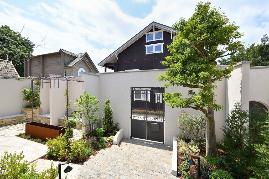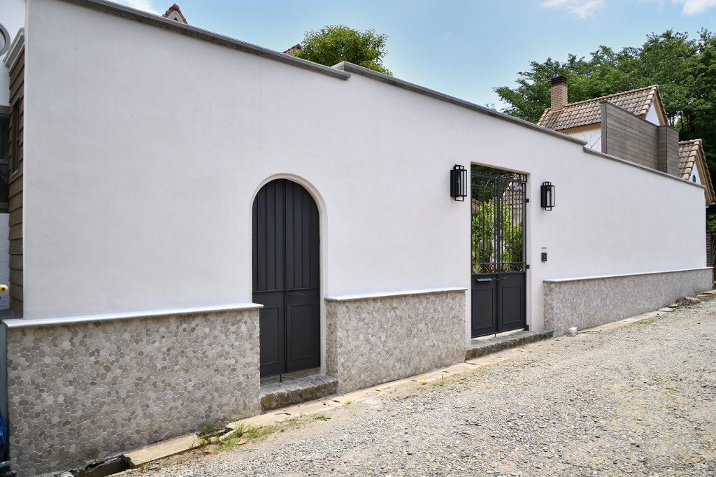 採光・採風などに配慮し自然のエネルギーを最大限に取り込める位置に塀を設け、漆喰の意匠性や機能を活かすことで、高さがありながらも、塀の内と外に美しく快適で安心・安全な空間を生み出すと共に、近隣を含めた持続可能な住環境を考える足掛かりにもなっている。