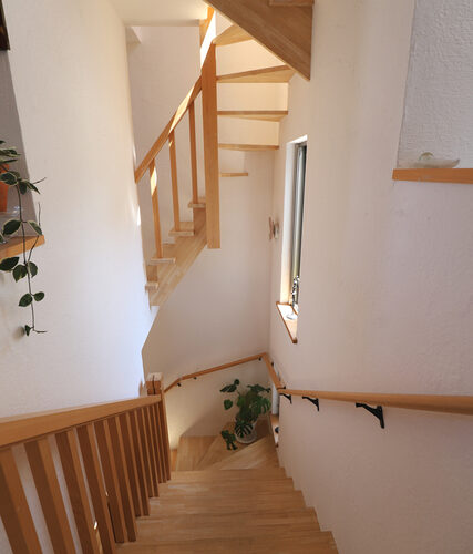 2Fリビングで朝日を浴びながら朝食もできる。開放感溢れる天然素材のいえ 千葉市I様邸 「壁と床と空気」が一つになる天然素材のナチュラルな空気感。生活導線にこだわり家事が楽になるストレスフリーな家 Gallery 一覧へ 前へ 次へ