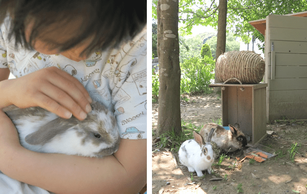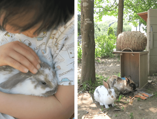 が、小屋が雪に埋まってしまうほどの大雪の日がありました。とても心配で駆けつけると、無事に乗り越えてくれました。しかしほっとしたのもつかの間、翌日、雪解け水で…それからしっかりとした家を造ろうと大きなウサギの家が完成しました。森の中のウサギの別荘と離れた母屋にウサギさんは現在20匹はいるでしょうか。イベントにはお子様の癒しの存在となってくれます。